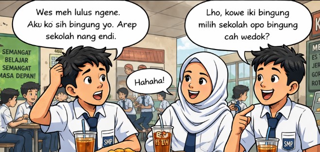 Awan kuwi neng kantin sekolah, ana telung bocah kelas IX SMP lagi nongkrong. Tas isih nemplok neng punggung, sepatu isih bledug, rai padha kaya wong mikir masa depan… nanging pesenané mung es teh karo gorengan sak piring dipangan bareng.