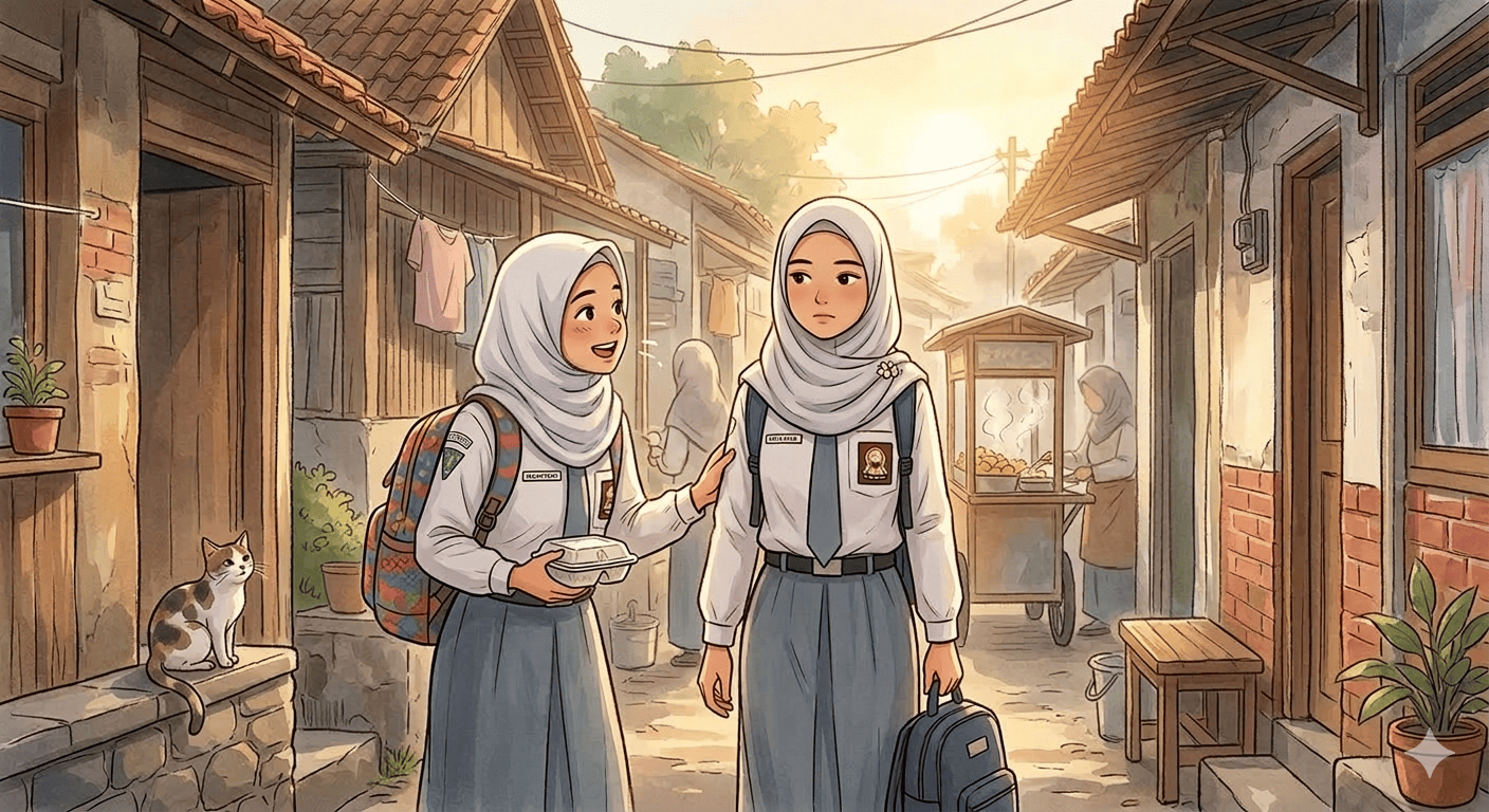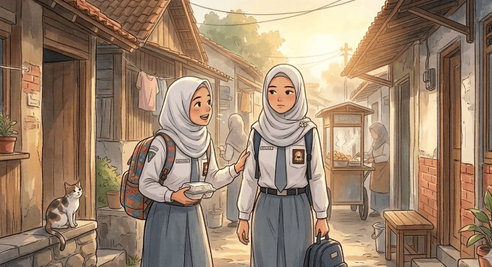 Suara cempreng itu menembus hiruk-pikuk pedagang sayur dan deru motor. Raina tidak perlu menoleh. Hanya ada satu orang yang memanggilnya dengan intonasi seperti itu. Olive, sahabatnya sejak SD, berlari kecil dengan tas punggung berwarna cerah yang terlihat terlalu besar di punggung mungilnya. Pipinya merona, napasnya sedikit terengah-engah.